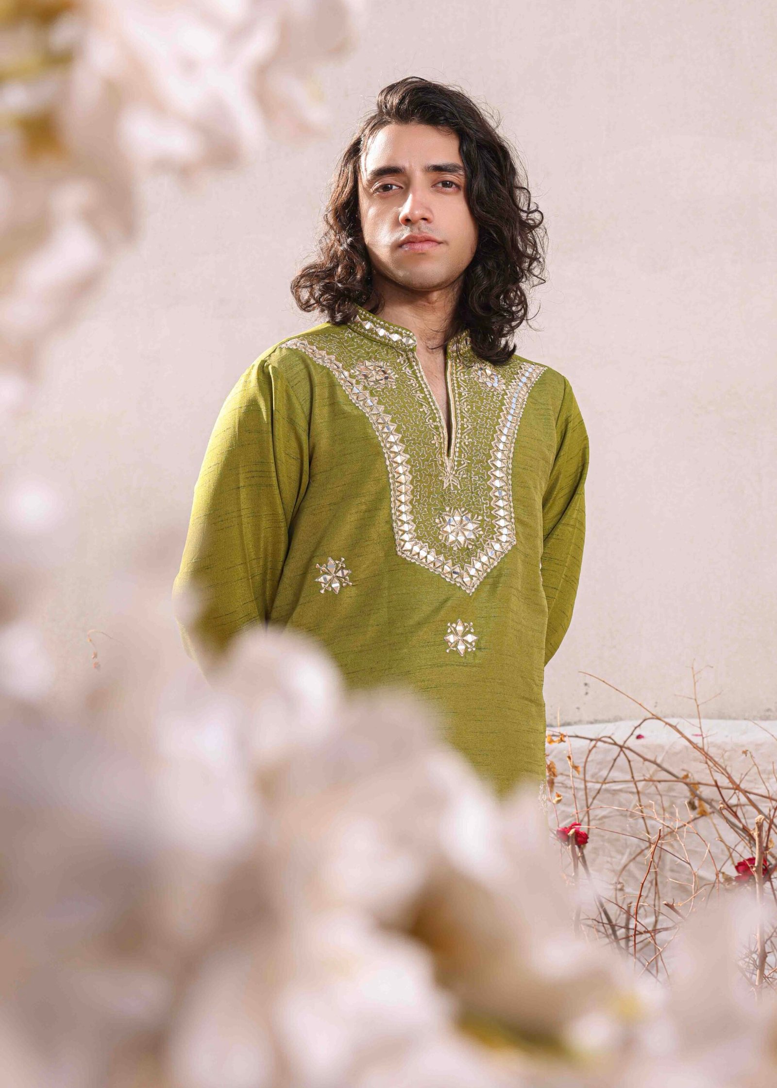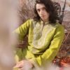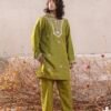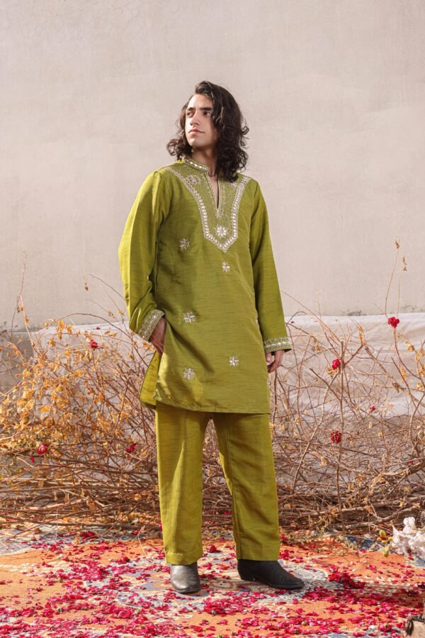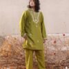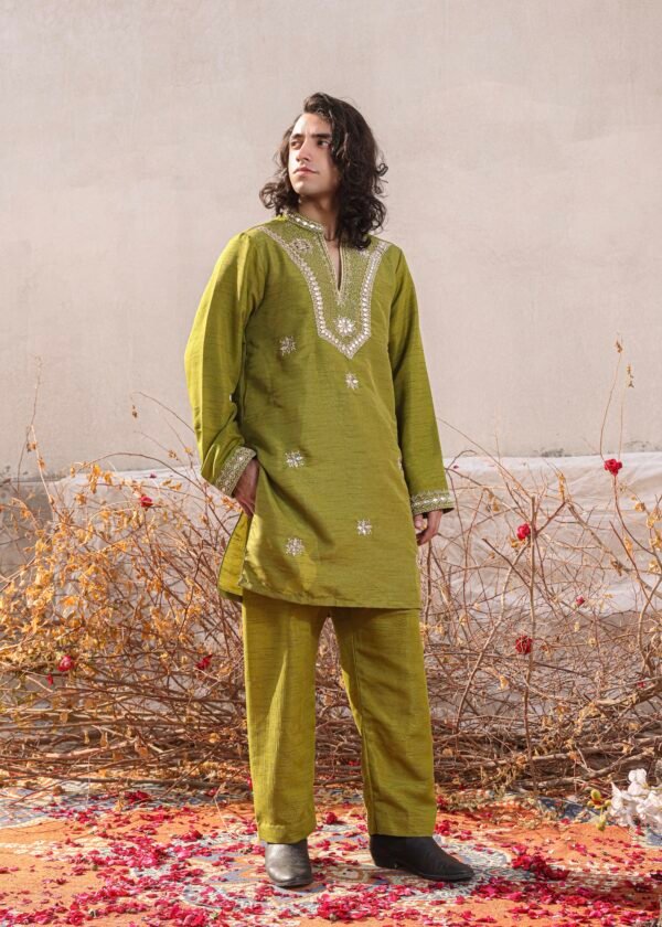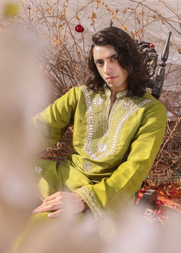 A gorgeous mehandi green ensemble with traditional adda work of mukesh. It’s paired with a raw silk green shalwar and kurta. This ensemble effortlessly combines elegance and style, making it a perfect choice for any occasion