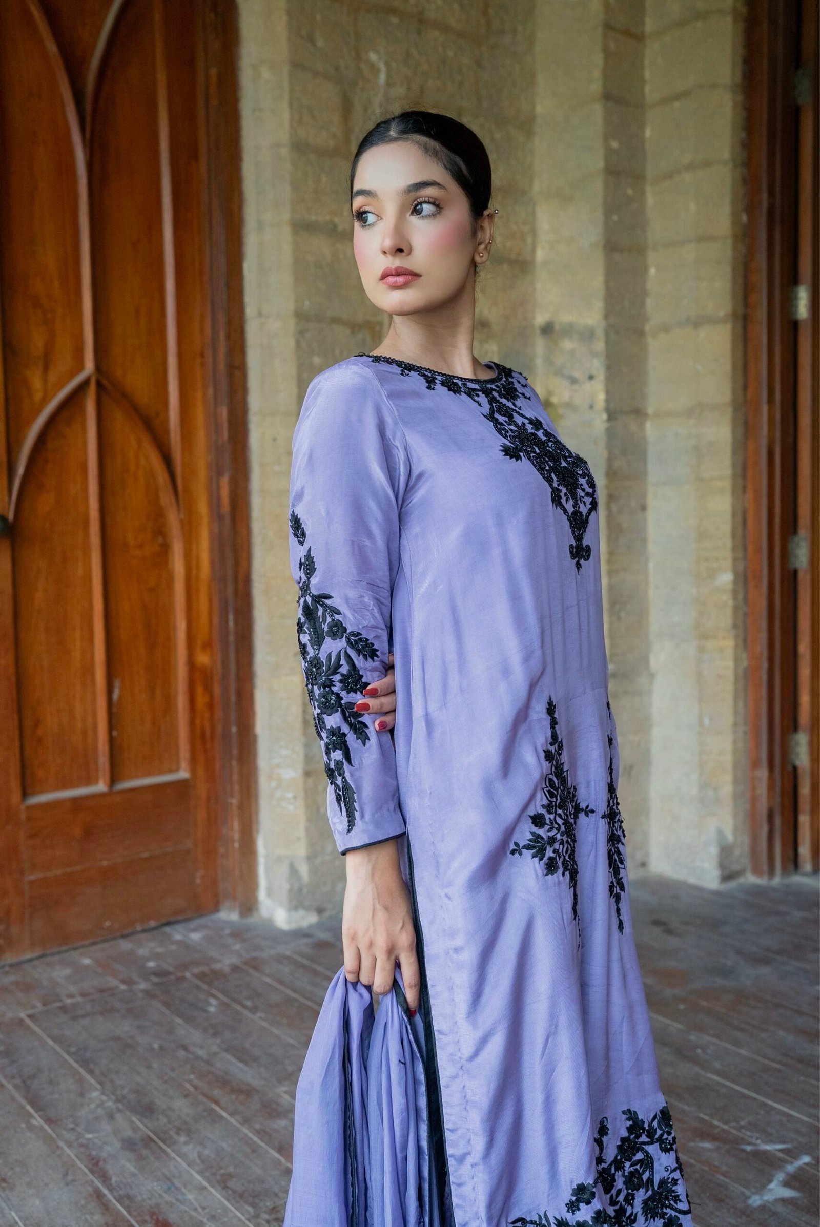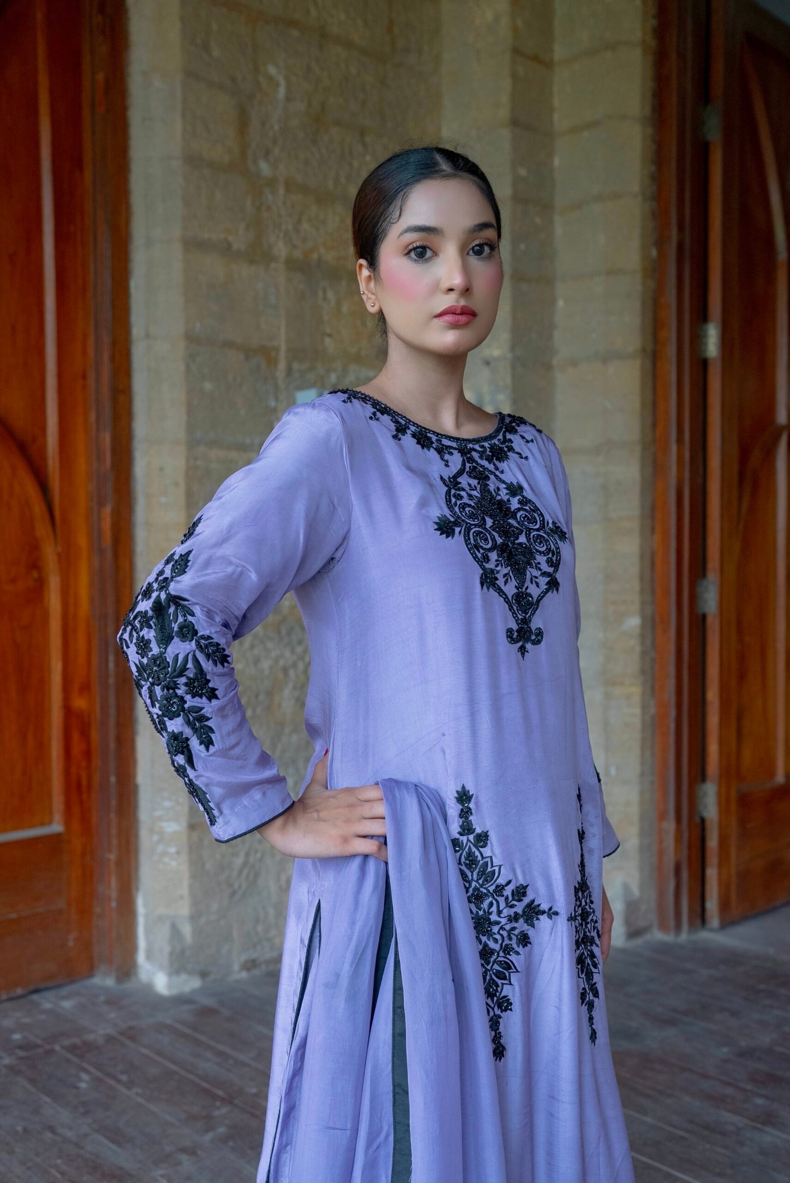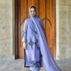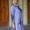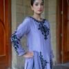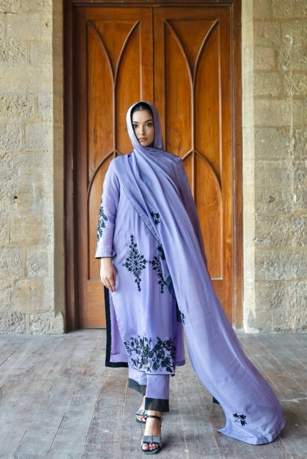 Embodying elegance and sophistication Gulnar is a lilac toned masterpiece adorned with exquisite black embroidery. The long silk shirt exudes a regal charm while the sleek secret pants add a touch of modern finesse. Its whisper light whistle dupatta finished with delicate handwork drapes gracefully completing this look of timeless beauty.