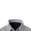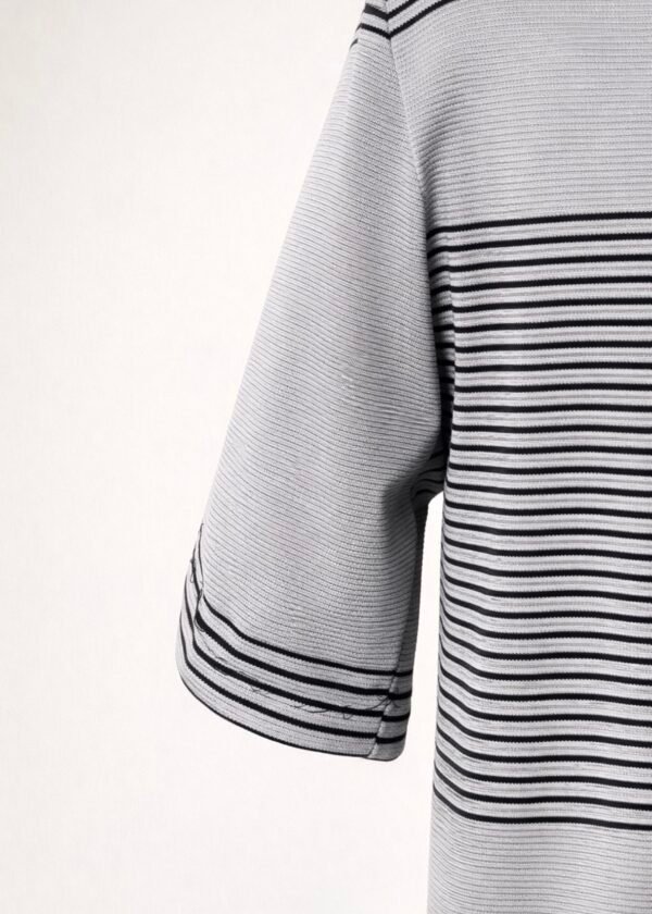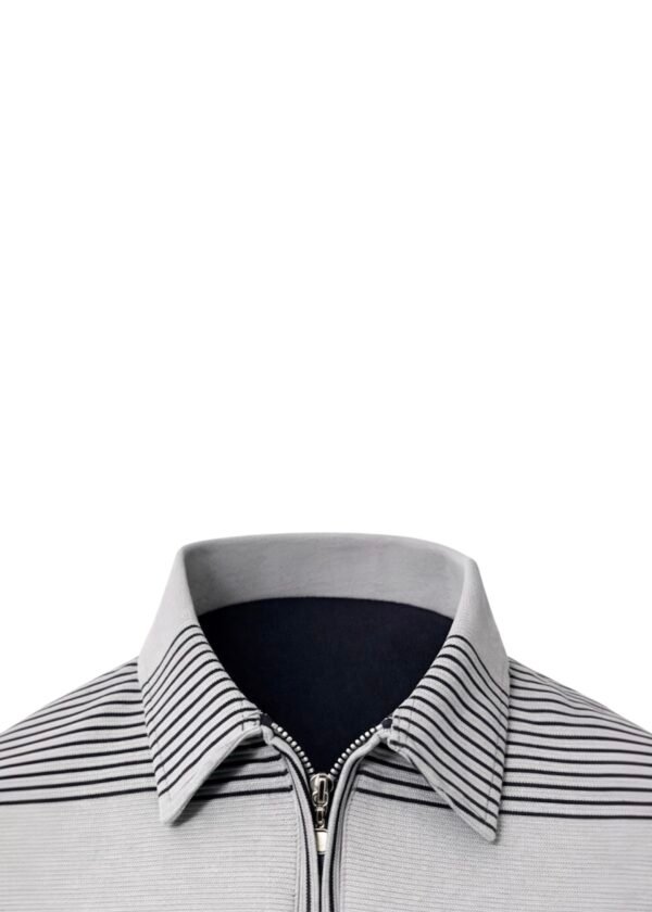 Elevate your everyday style with this modern striped zip-collar polo. Designed in a refined grey tone with sleek horizontal stripe detailing, this piece blends sophistication with comfort. The structured collar and metallic half-zip closure add a contemporary edge, making it perfect for both smart-casual events and upscale everyday wear.