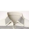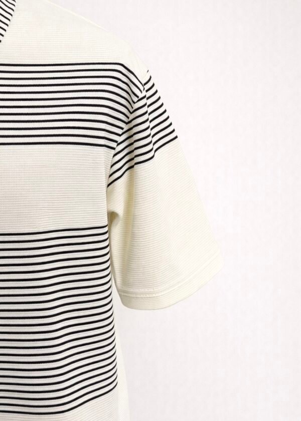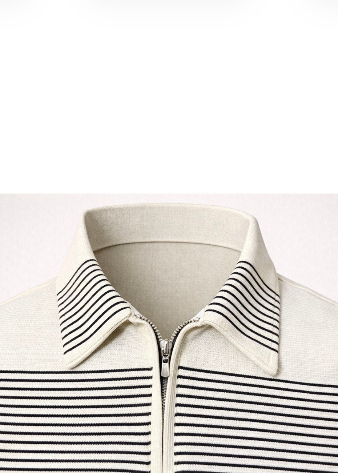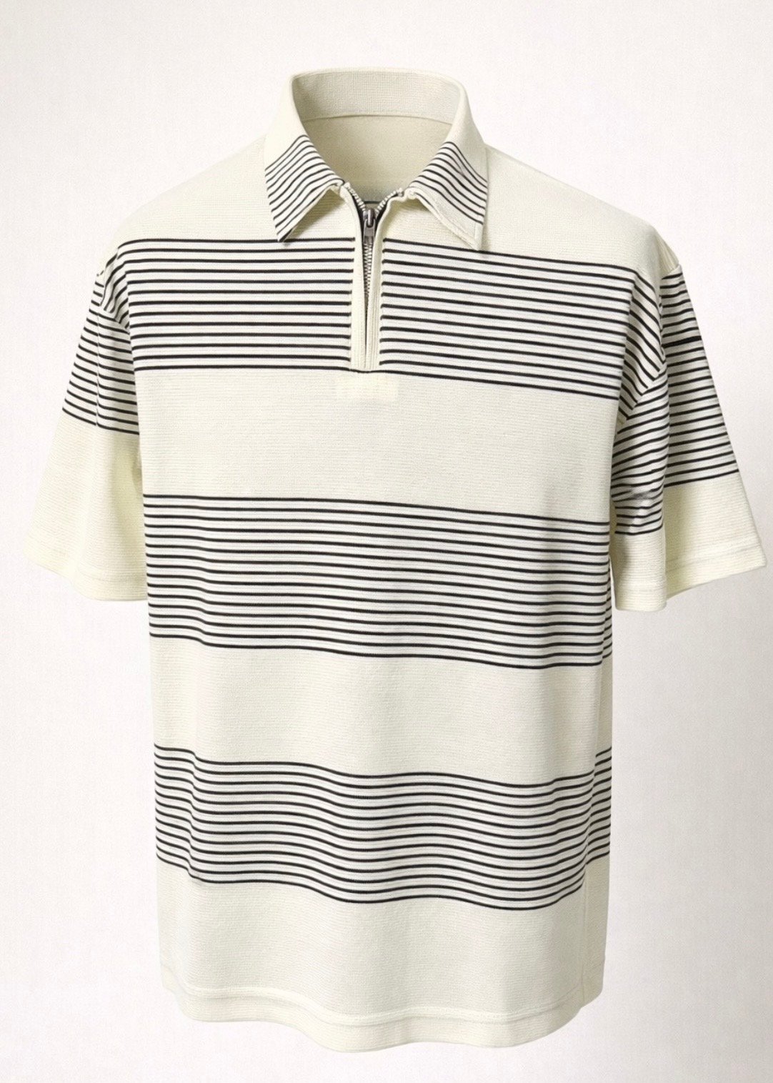 The Monaco Stripe Zip Polo is crafted in a refined cream tone with sleek black horizontal stripe detailing for a bold yet sophisticated finish. The structured collar and polished metal half-zip closure create a sharp silhouette, while the premium knit fabric delivers comfort with a tailored feel.