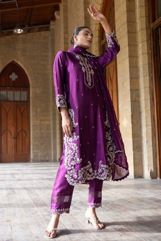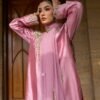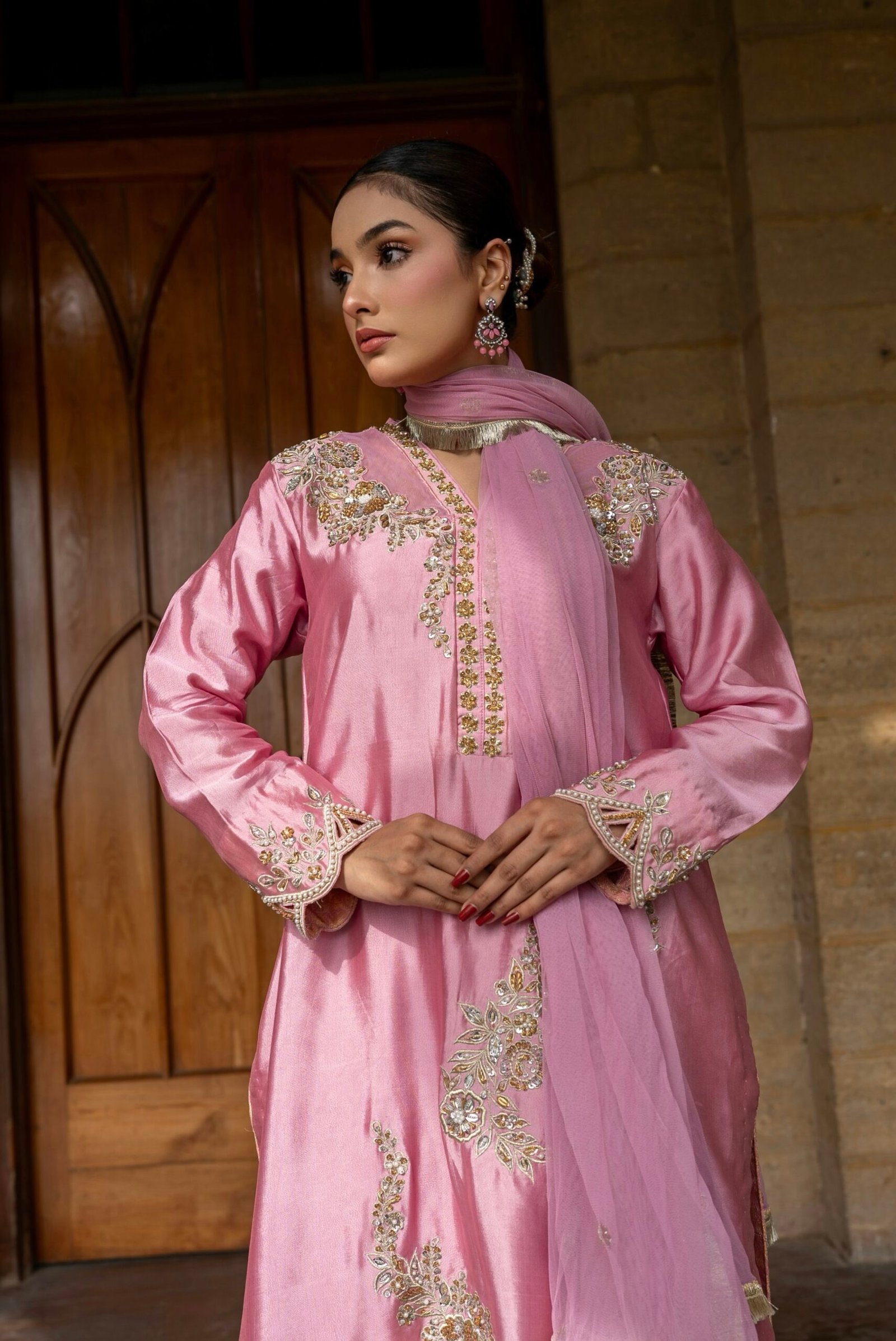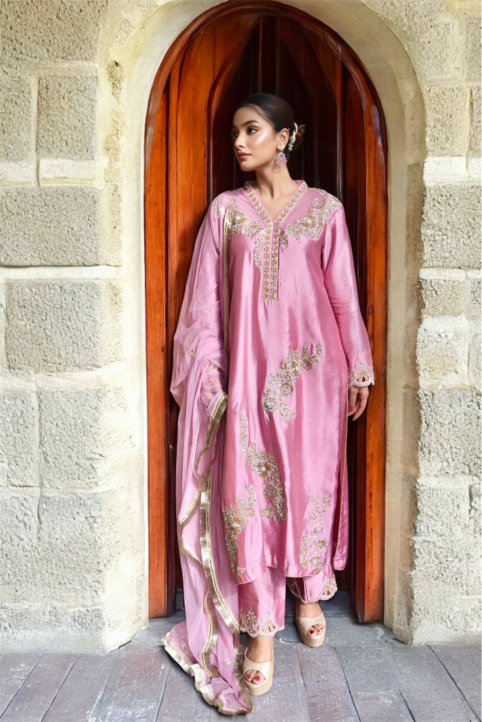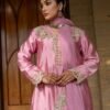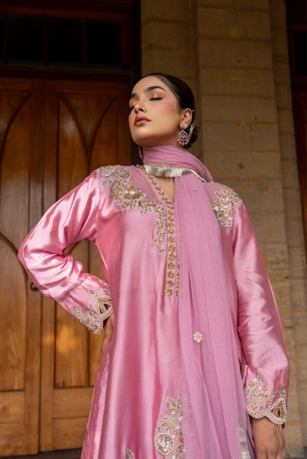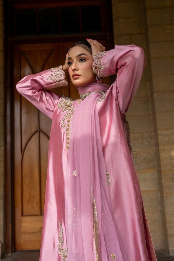 Radiate timeless charm in Gulnaar Grace, a masterpiece crafted on luxurious shisha raw silk in a soft blush tone. Adorned with delicate golden embroidery this outfit beautifully blends traditional artistry with modern sophistication. Perfect for festive gatherings or elegant soirées, Gulnaar Grace brings out your inner glow with every step.