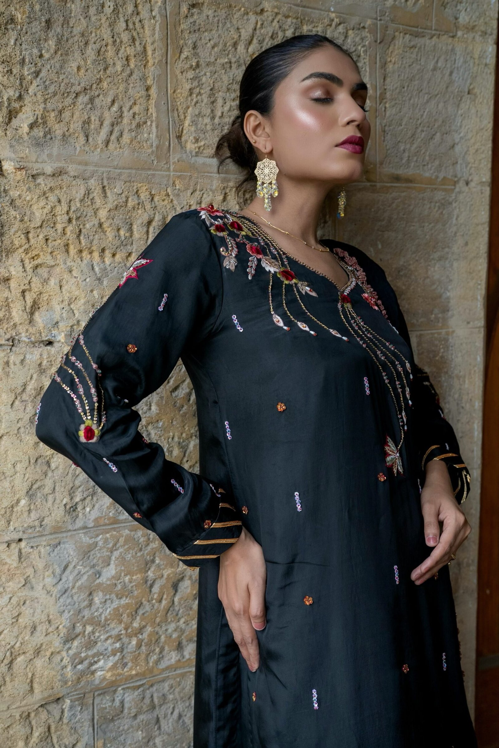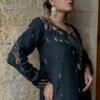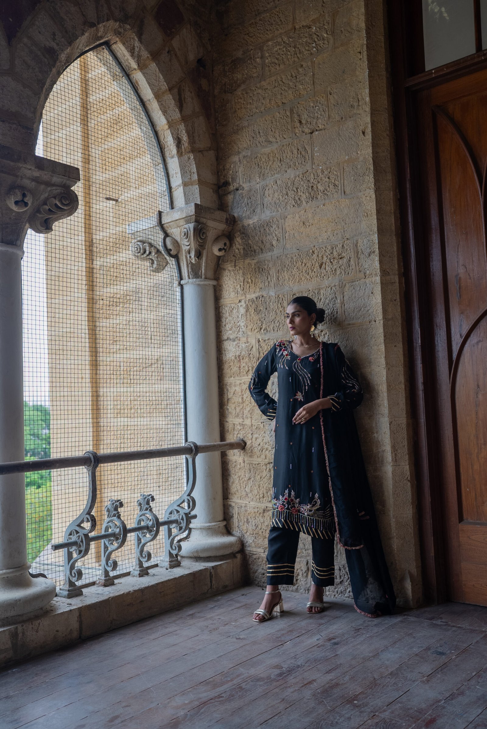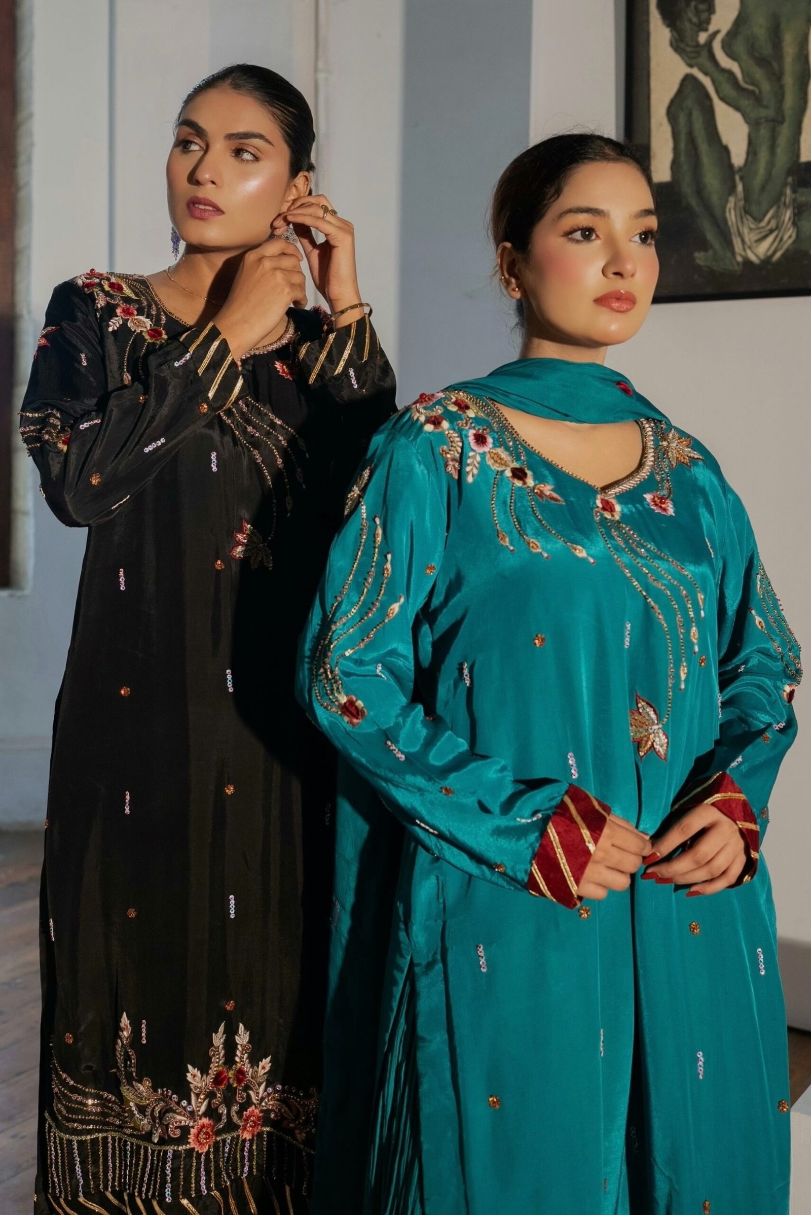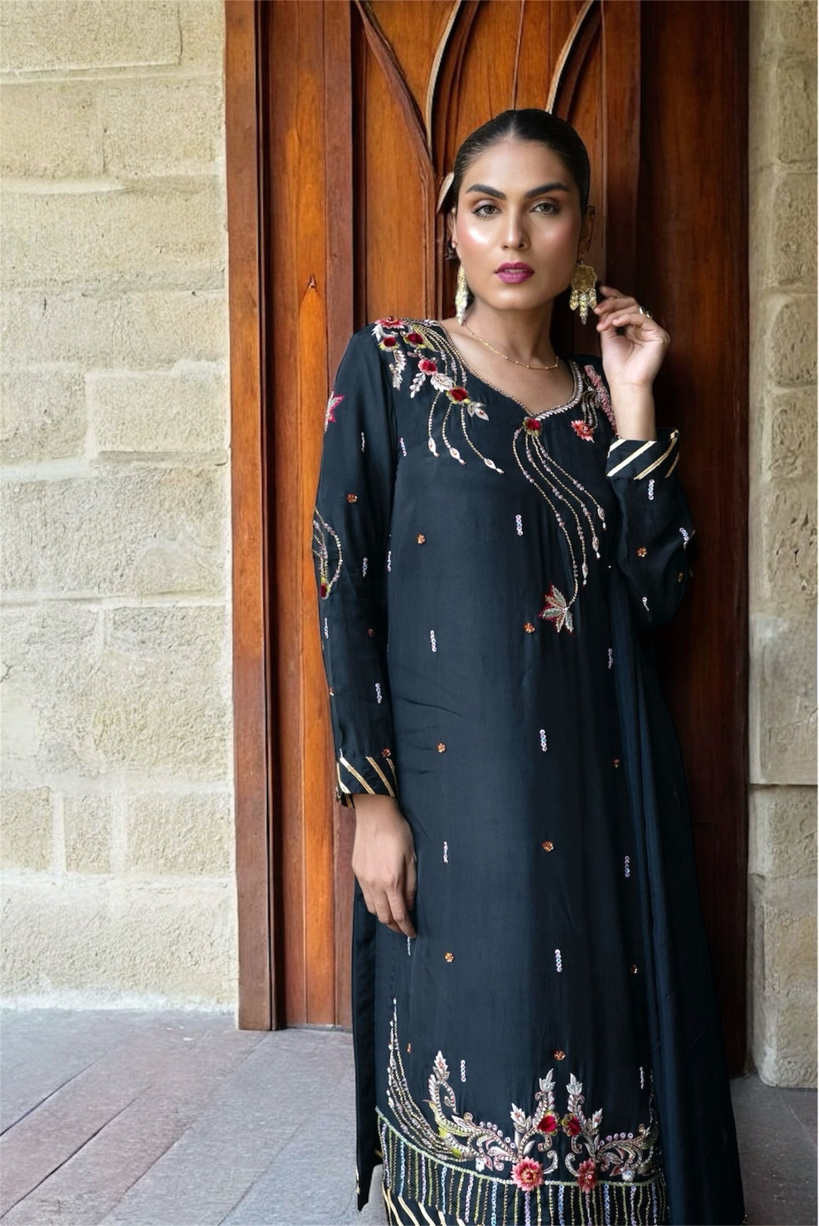 Where timeless tradition meets the freshness of spring, Midnight Bloom is crafted from luxurious silk adorned with delicate kora tapka and tilla embroidery. The rich black hue exudes sophistication while silver accents bloom like spring blossoms across the fabric. A perfect blend of regality and grace, this ensemble is designed for festive evenings and elegant celebrations.